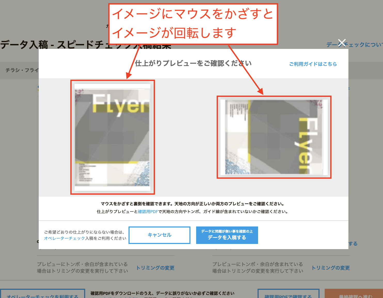- 最終確認の画面が表示されますので、イメージにマウスをかざし、ウラオモテの配置や天地の方向をご確認ください。