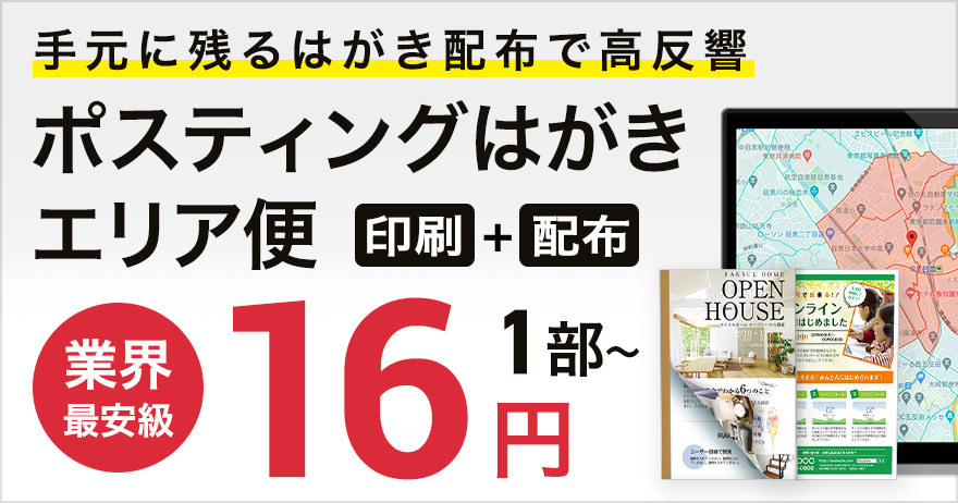 「ポスティングはがき エリア便」は指定エリアへはがきを配布するサービスです。下記のような特徴があります。