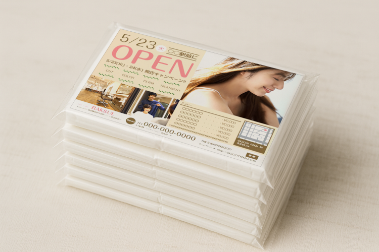 ポケットティッシュは、街頭配布やイベント、教育機関など幅広いシーンで活用できる定番の販促ツールです。チラシよりも受け取ってもらいやすく、手元に長く残るため、広告効果が継続するのが大きな魅力です。本記事では、ポケットティッシュの販促メリットや効果が出やすい用途(店舗集客・イベント告知・教育機関での活用)を詳しく紹介。さらに、ラクスルでの料金・納期・注文方法についても解説します。コストを抑えながら効果的に集客を目指す方は、ぜひ参考にしてください。