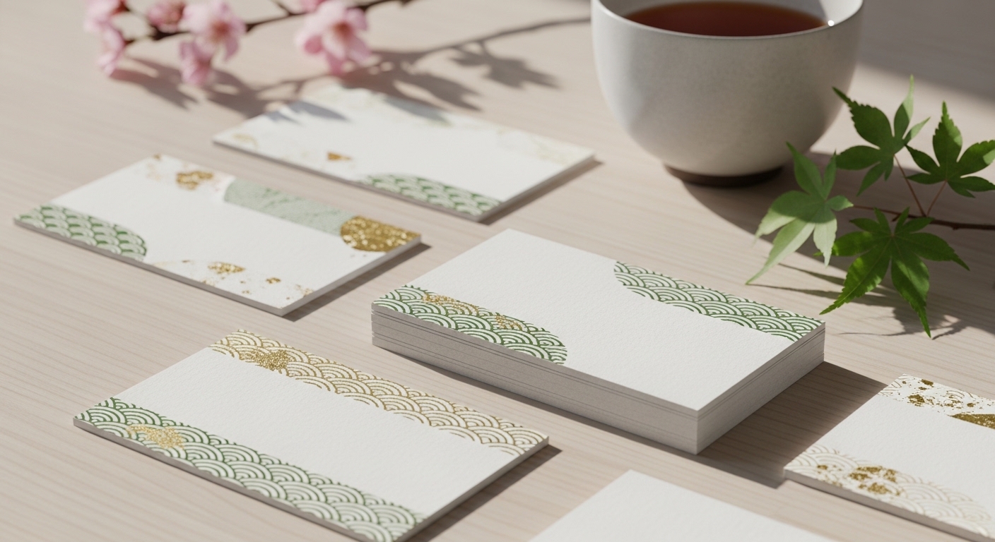 和風のデザインには「和紙」のような風合いを感じさせる用紙や、少し厚みのあるマット系の用紙がよく馴染みます。光沢を抑えたマット紙を選ぶことで、しっとりとした上品な質感が加わり、落ち着いた大人の印象を強調することができます。また、あえて「角丸加工」を施すことで、和の持つ「柔らかさ」や「おもてなしの心」を表現するのも一つのテクニックです。