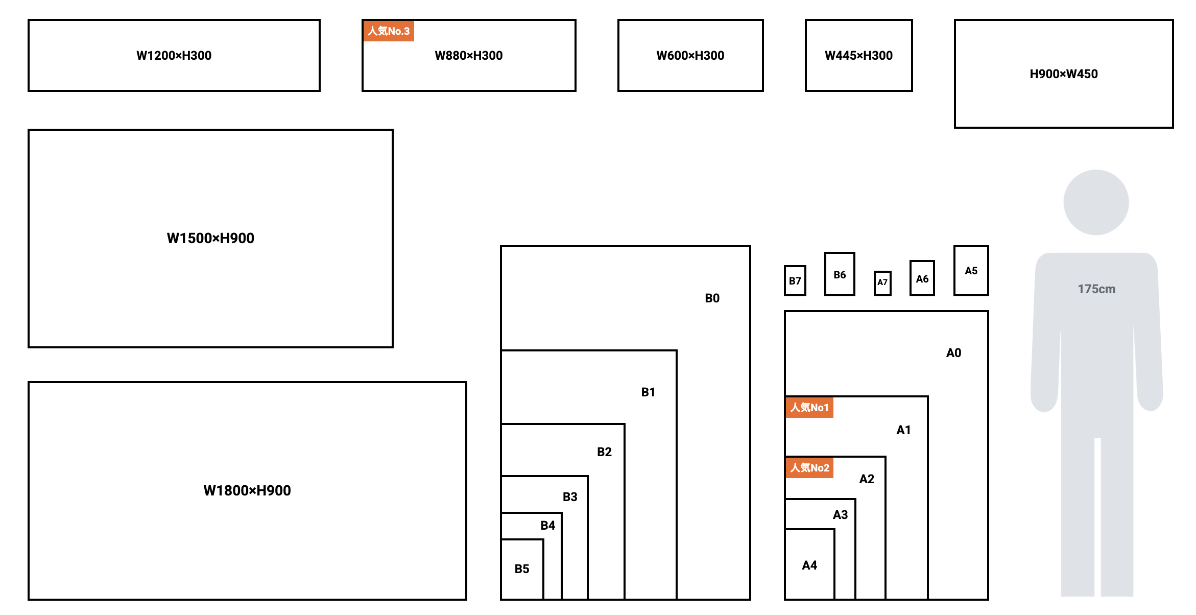 W1500×H900mm:店舗の壁面看板やイベント告知、公共施設の案内板としてよく使われるサイズ。適度な大きさで、限られたスペースでも効果的に情報を伝えられる。