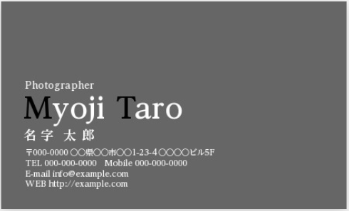 重厚な黒の背景に、整然としたタイポグラフィが映えるデザインです。無駄を一切省いたミニマルな構成は、高級感を演出しつつも、相手に誠実でプロフェッショナルな印象を与えます。特にコントラストを活かした白抜き文字は視認性が高く、重要な情報をストレートに伝えます。