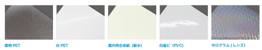 白ベースの PET フィルムは、インクの発色がくっきり出るタイプです。ロゴや文字をはっきり見せたい、キャラクターのイラストを紙に印刷したような仕上がりで見せたい場合に選びます。