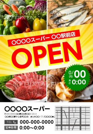 新規オープンスーパーに適したデザインテンプレートです。大きな「OPEN」の文字が目を惹きます。