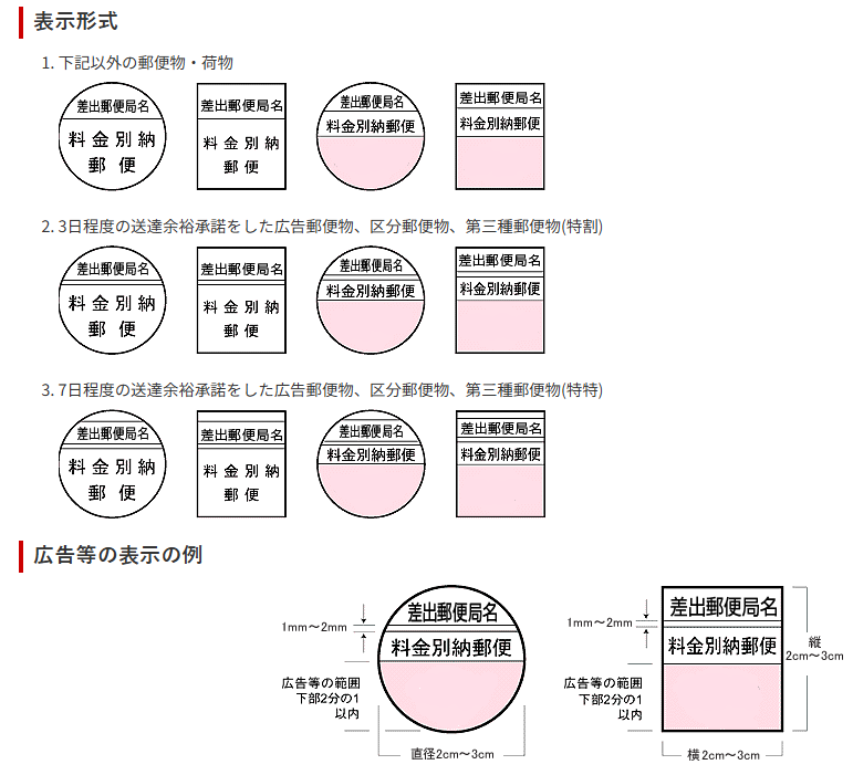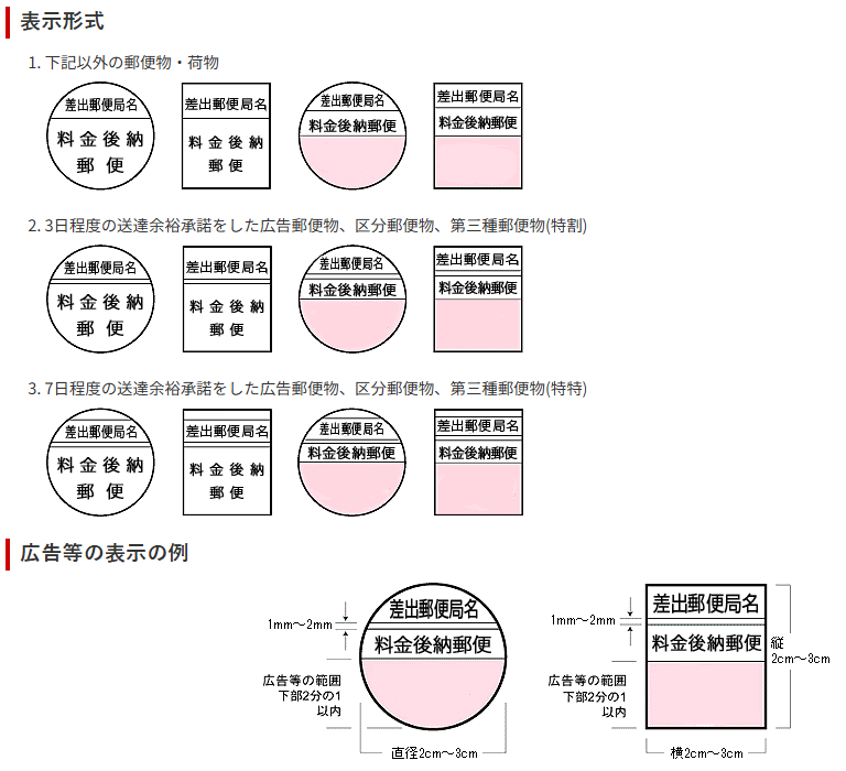 料金別納郵便・料金後納郵便のマークを表示する際は、以下の点に注意してください。