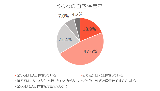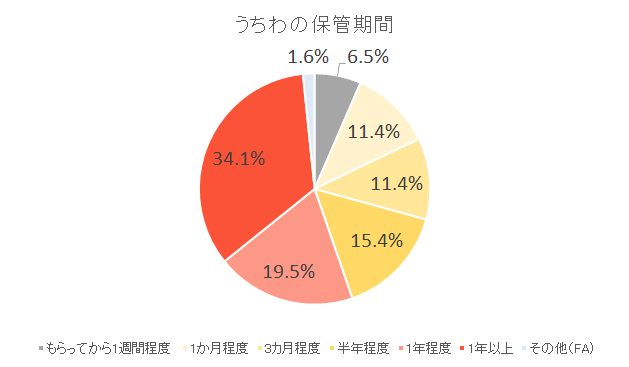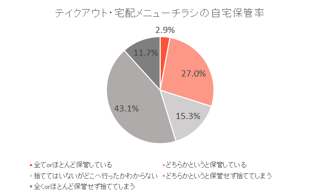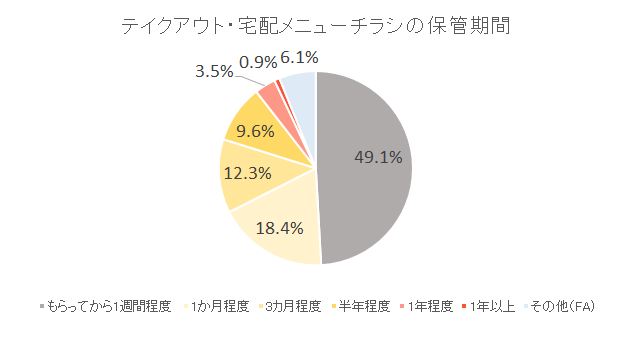 ・テイクアウトメニューのチラシの自宅での保管率は29.9%、保管期間も1週間程度が49.1% ・うちはの保管率は66.5%、保管期間は半年以上が69.0%、1年程度以上が53.6%と過半数以上