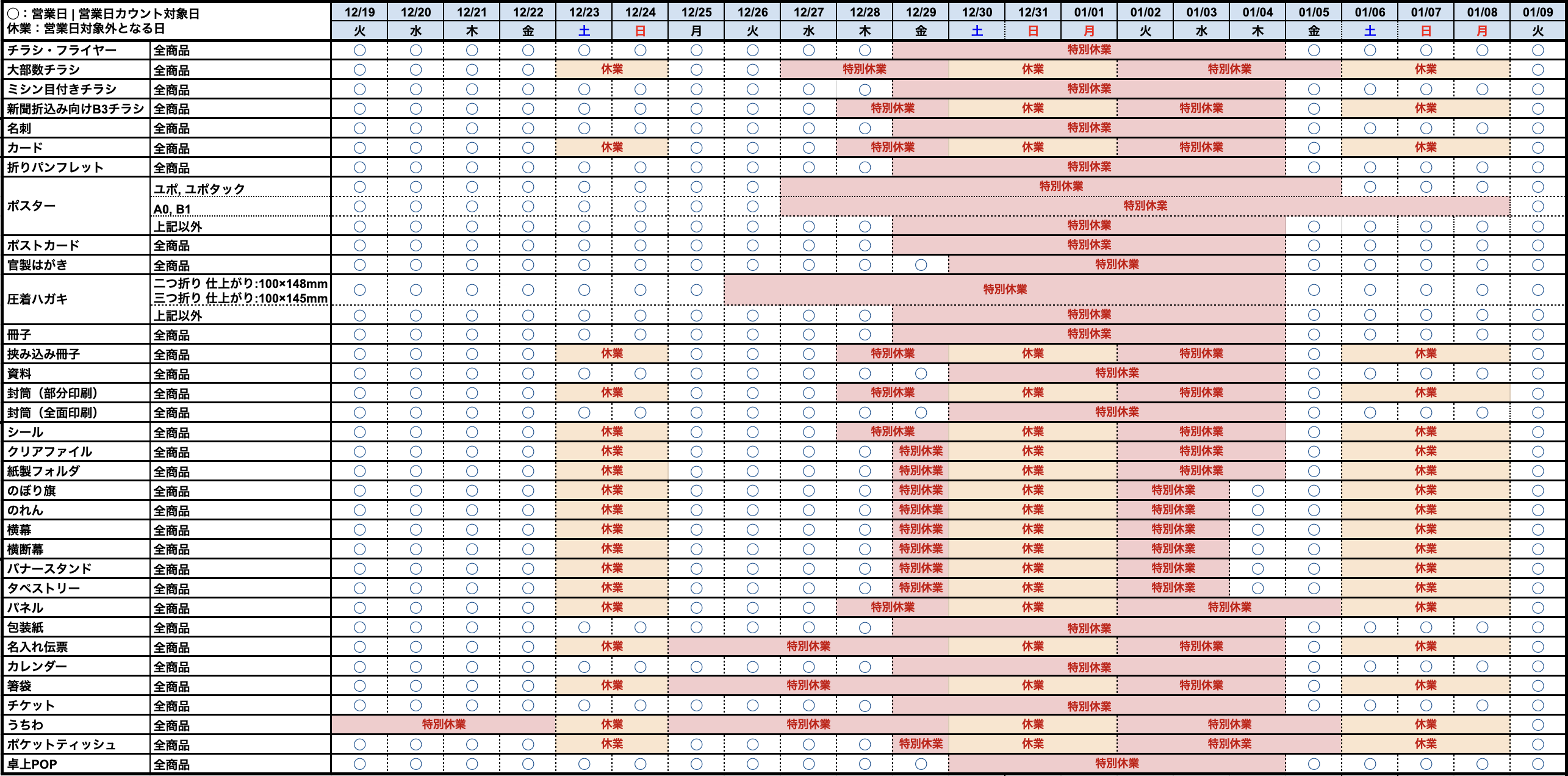- 印刷の各種サンプルの2023年12月29日~2024年1月3日受付分につきましては、2024年1月4日以降の発送となります。