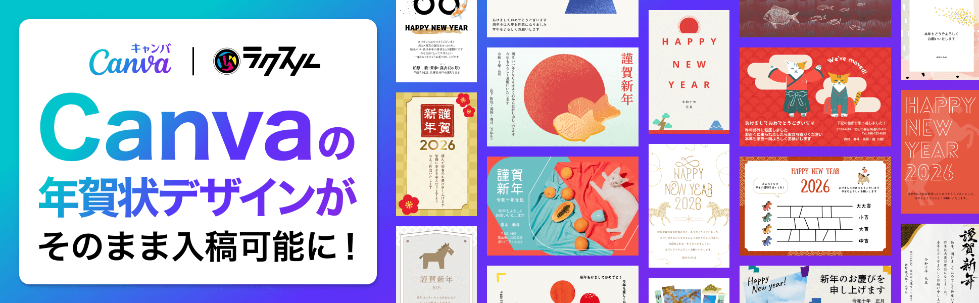Canvaで作成した年賀状のデザインがそのまま入稿可能に!2025年11月28日 年賀状印刷で、Canvaで作成したデザインデータをそのまま入稿できるようになりました! 【手順】 年賀状印刷で商品を選択してカートに追加して注文を完了してください。(「宛名印刷あり」の場合、宛名のアップロードが必要です) 「データ入稿」からCanvaのデータを選択して入稿することができます。 入稿方法の詳細はご利用ガイドでご案内しています。 年賀状印刷を注文する