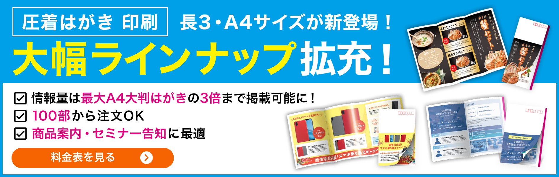 この度、圧着はがき印刷にて「長3サイズ」と「A4サイズ」が新たに加わりました。