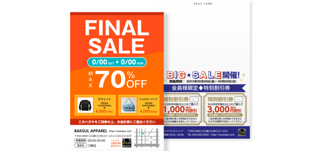 セールやキャンペーンの情報をわかりやすく伝えるDMやハガキ印刷に最適です。割引や特典を効果的に告知し、集客アップをサポートします。