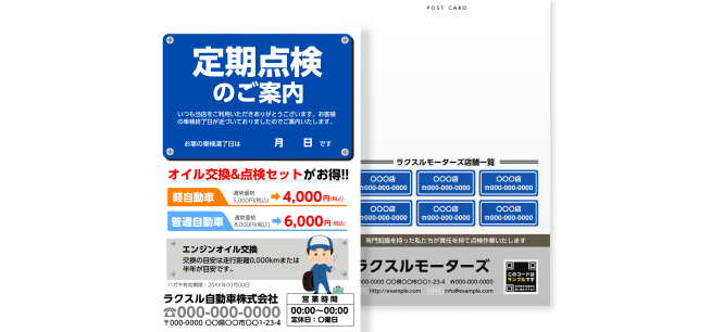 車検・設備・機器の定期点検やメンテナンス案内に。お知らせを郵送で確実に届け、リピート率向上につながります。