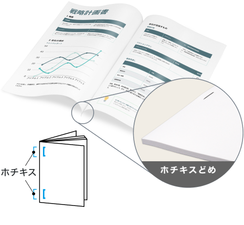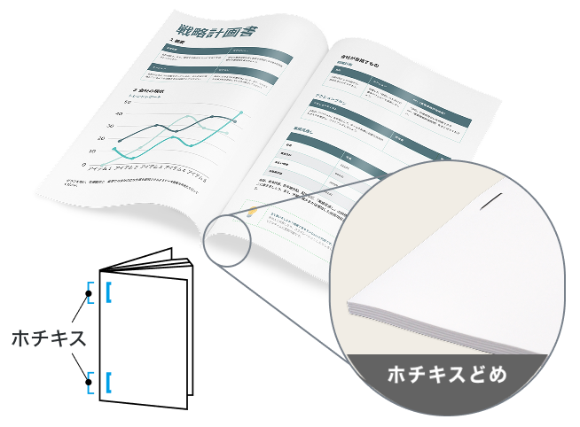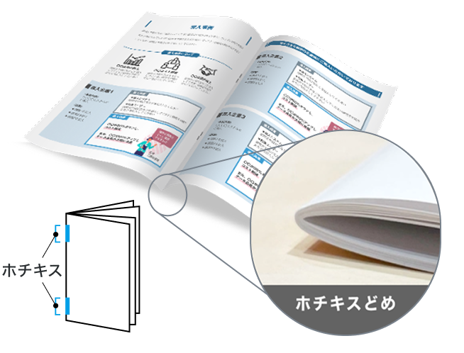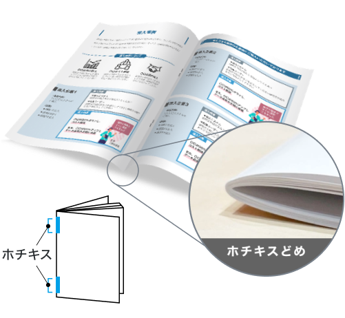 1ヶ所または2ヶ所を上からホチキスで留める製本方法です。