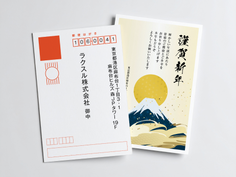 ラクスルの年賀状はすべてお年玉付き年賀状です。宛名面には郵便番号枠や年賀マークが元から印字されています。