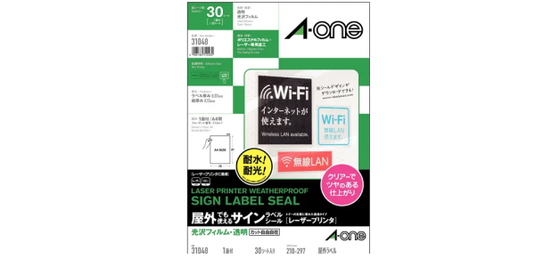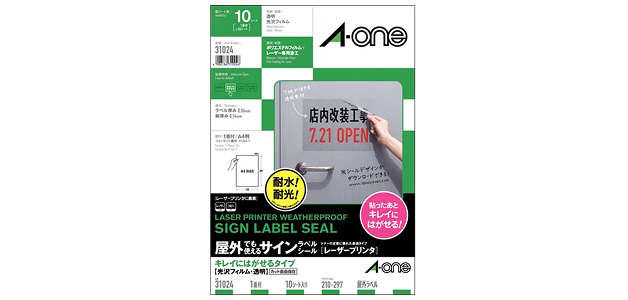 丈夫で水に強い透明のフィルム素材です。透明な容器を使った商品ラベルや窓ガラスへの貼り付けなどで多く使用されています。