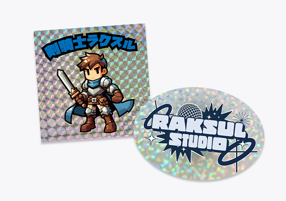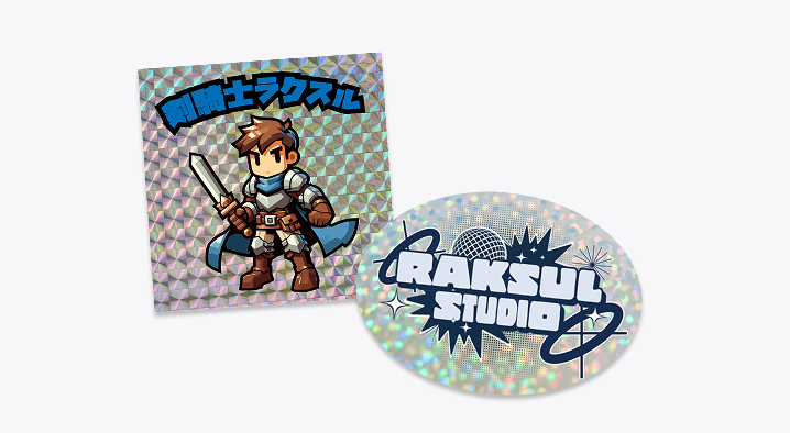銀色をベースとしたスクエア柄のホログラム素材です。オリジナルのキャラクターのステッカーとして多く使用されています。また、光沢ラミネート(PET)加工を施すことで、耐久性が上がり光沢のある高級感を演出することができます。※1